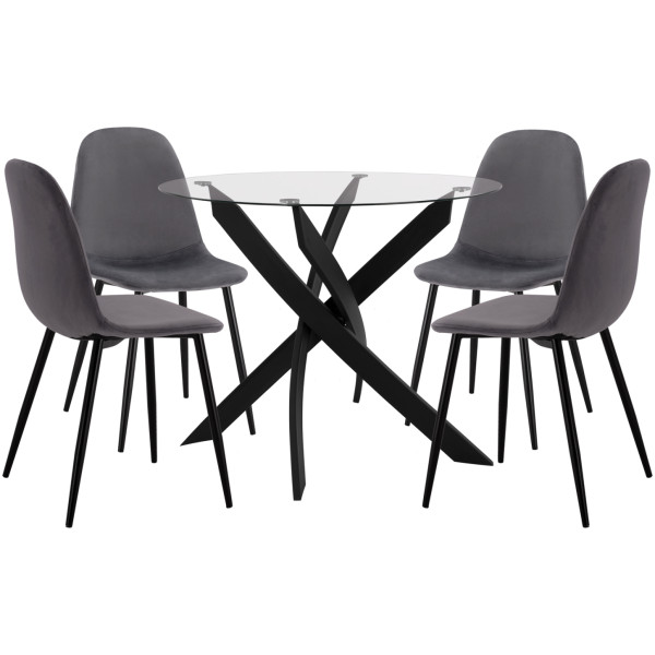 Το σετ τραπεζαρίας εσωτερικού χώρου JAFARU αποτελείται από 4 καρέκλες επενδυμένες με βελούδο με μεσαίου ύψους πλάτη και μεταλλικά πόδια,