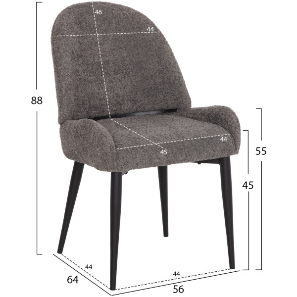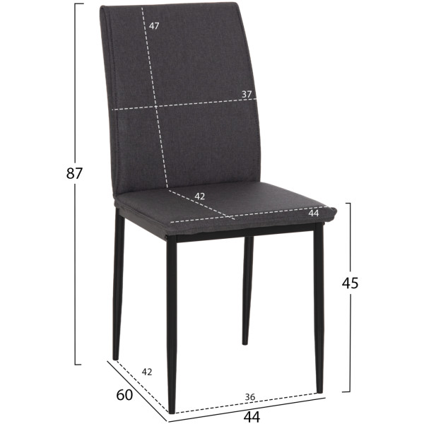 Η καρέκλα SARKY έχει κυρίαρχο χρώμα το ΓΚΡΙ, και 4 μαύρα μεταλλικά πόδια, ενώ η πλάτη είναι κυρτή αγκαλιάζοντας το