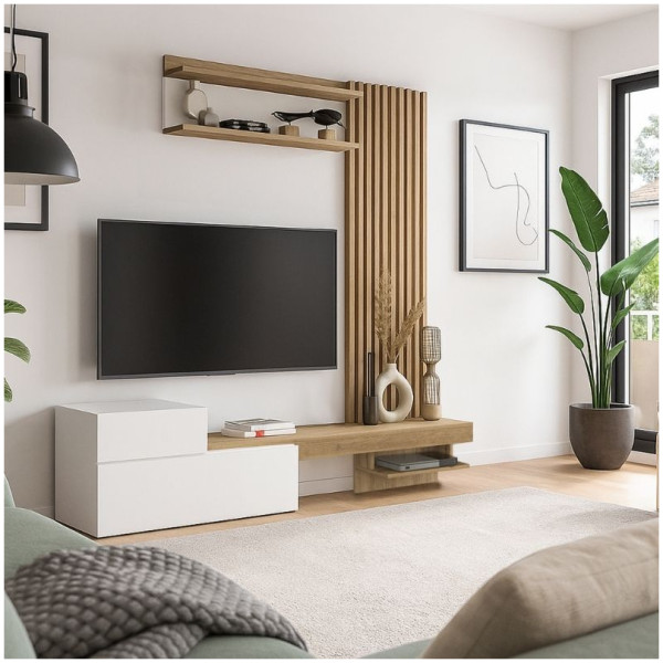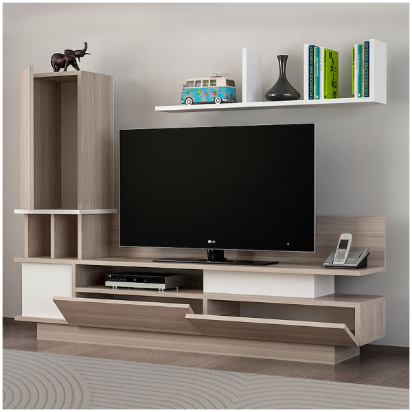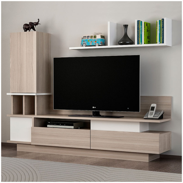 Σύνθεση τηλεόρασης Dumont Megapap χρώμα λευκό – sepet oak 180×36,8×200εκ. Η σύνθεση τηλεόρασης Dumont είναι ένα μοντέρνο και επιβλητικό έπιπλο με minimal