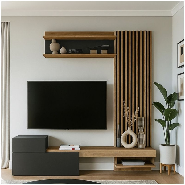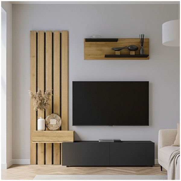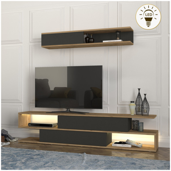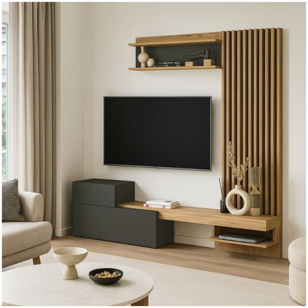 Σύνθεση τηλεόρασης Rosaline Megapap χρώμα ανθρακί – sepet oak 183×31,3×196,9εκ. Η σύνθεση τηλεόρασης Rosaline είναι ένα μοντέρνο και επιβλητικό έπιπλο με minimal