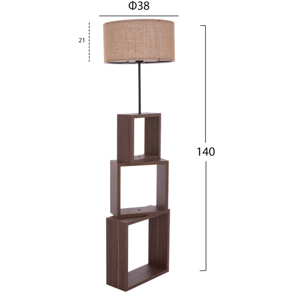 Μοντέρνο φωτιστικό δαπέδου με 3 κύβους-ράφια σε καρυδί χρώμα MDF, μαύρη κολώνα που συνδέει τα ράφια με το φωτιστικό και