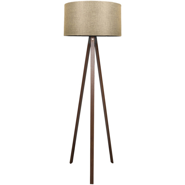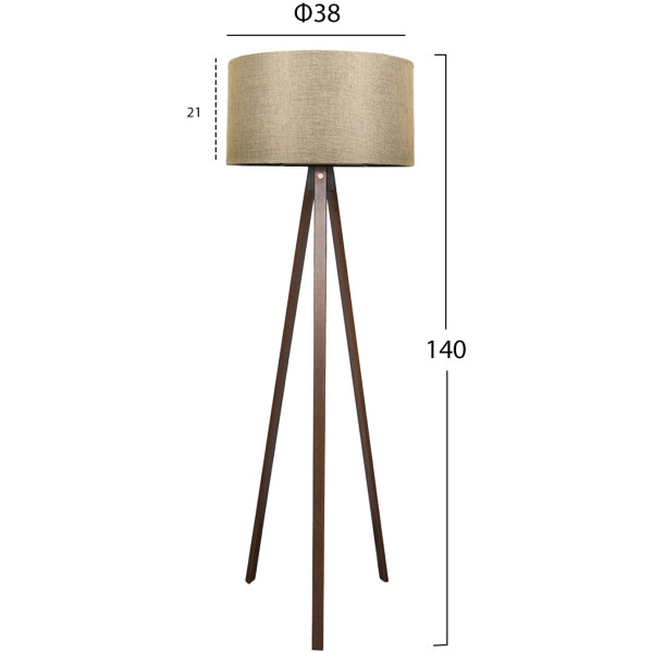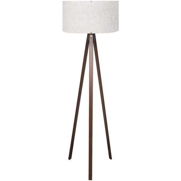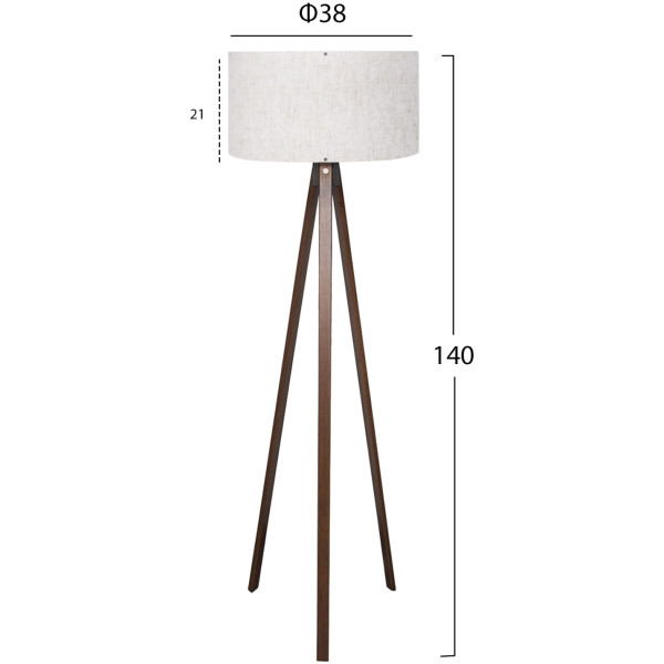 Φωτιστικό δαπέδου με τρίποδο από 100% MDF σε καρυδί χρώμα. Το κυλινδρικό τύμπανο του φωτιστικού είναι σε χρώμα εκρού. Ένα
