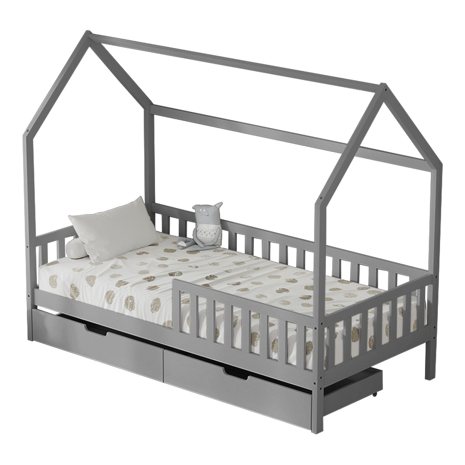 Το στρώμα τοποθετείται σε τάβλες κατασκευασμένες από ξυλεία κόντρα πλακέ. Ολόκληρο το κρεβάτι έχει σχήμα σπιτιού και μάλιστα αρκετά ψηλό, που θα δώσει μια ευχάριστη, «ζεστή», και παιχνιδιάρικη όψη σε κάθε παιδικό δωμάτιο.