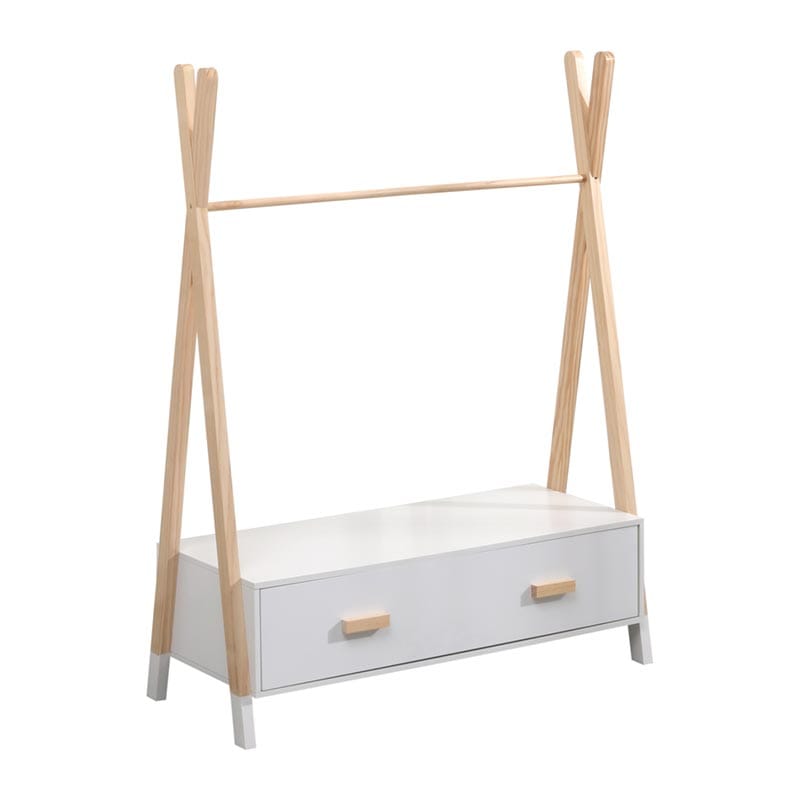 Σας παρουσιάζουμε την καινούργια παιδική ανοιχτή κρεμάστρα PASCHAL. Είναι βολική σε διαστάσεις και διαθέτει μία μπάρα κρέμασης ρούχων και 2 πρακτικά συρτάρια στο κάτω μέρος, σε ΛΕΥΚΟ χρώμα. Στηρίζεται σε δύο ξύλινα χιαστί πόδια σε ΦΥΣΙΚΟ χρώμα ξύλου στις δύο πλευρές. Είναι βαμμένη με αβλαβές βερνίκι με βάση το νερό και μη τοξικό, ιδανικό για παιδιά.
