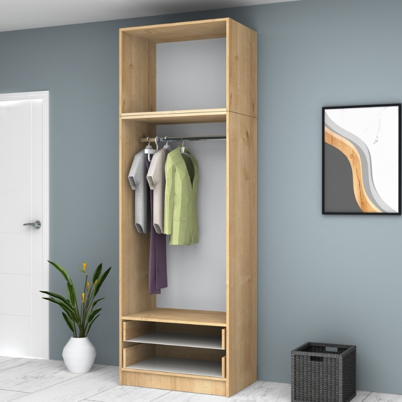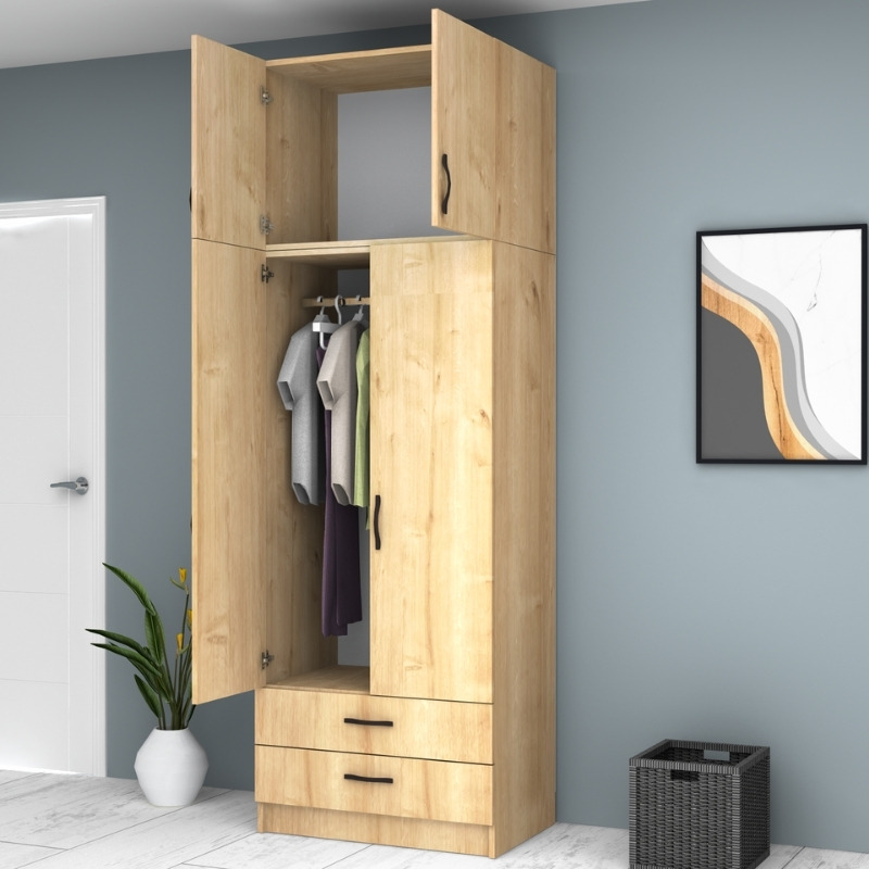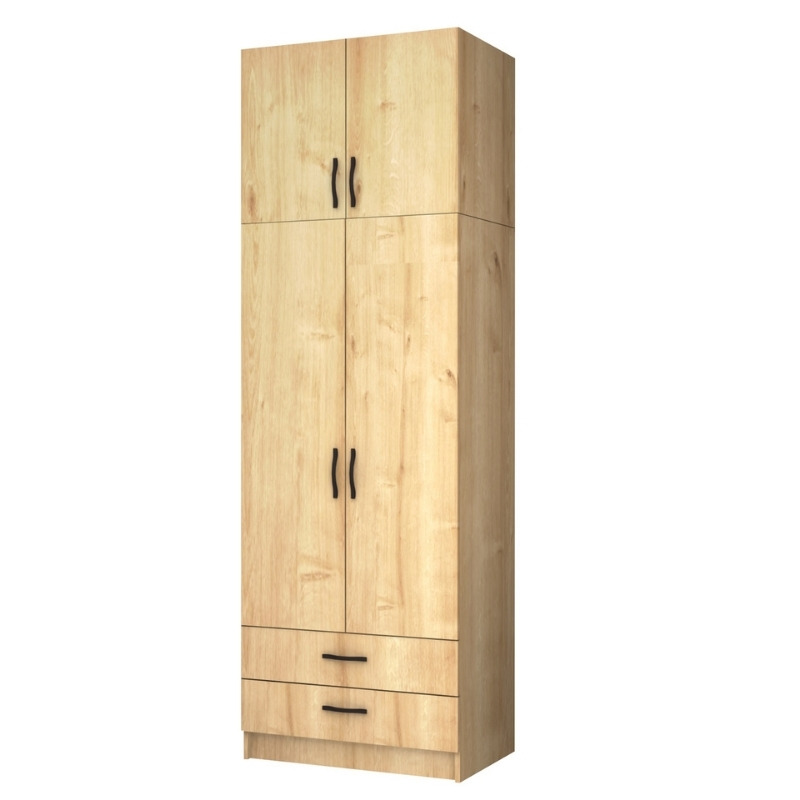Ντουλάπα ρούχων Ricardo δίφυλλη με πατάρι και συρτάρια χρώμα φυσικό οξιάς 80×51,8×240εκ.
