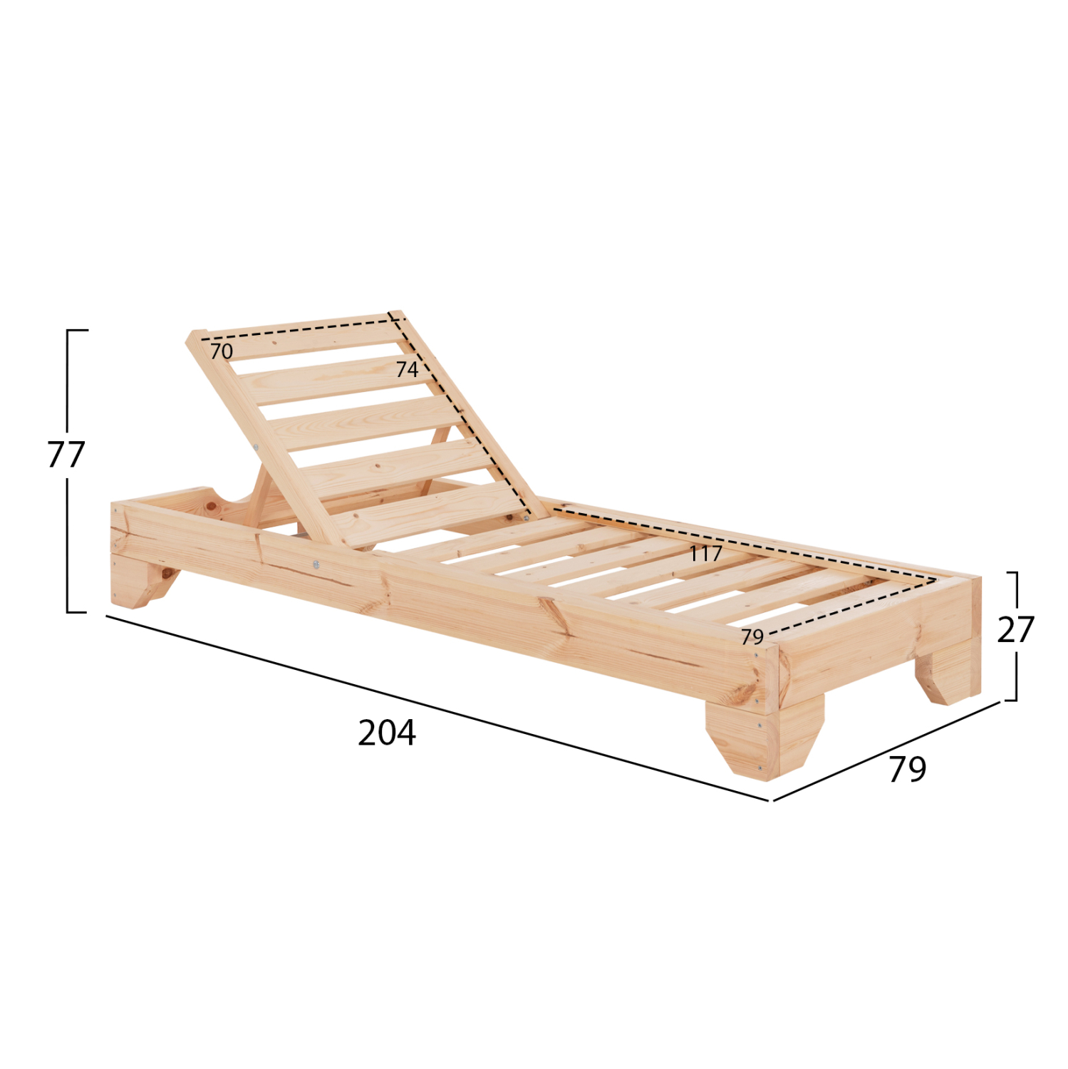 -Ολόκληρη η ξαπλώστρα έχει κατασκευαστεί από ξύλο πεύκου με εμποτισμό και επιπλέον στρώση με βερνίκι νερού. Το πεύκο είναι ένα μαλακό, λευκό ή ανοιχτό κίτρινο ξύλο το οποίο είναι ελαφρύ σε βάρος με ευθύγραμμα νερά ξύλου. Αντέχει στη συρρίκνωση, διόγκωση και κάμψη. Ο εμποτισμός υπό την ευρεία έννοια είναι ο χρωματισμός του ξύλου (συνήθως βερνίκια) με την μέθοδο της εμβάπτισης.