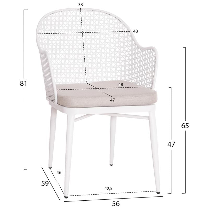 Το OREGO είναι ένα lounge σετ (σαλονάκι) 3τμχ εξωτερικού χώρου, που αποτελείται από 2 πολυθρόνες αλουμινίου κι ένα στρογγυλό μεταλλικό τραπεζάκι, όλα σε χρώμα ΛΕΥΚΟ. Τα μαξιλάρια καθίσματος στις πολυθρόνες είναι σε ανοιχτό γκρι χρώμα.